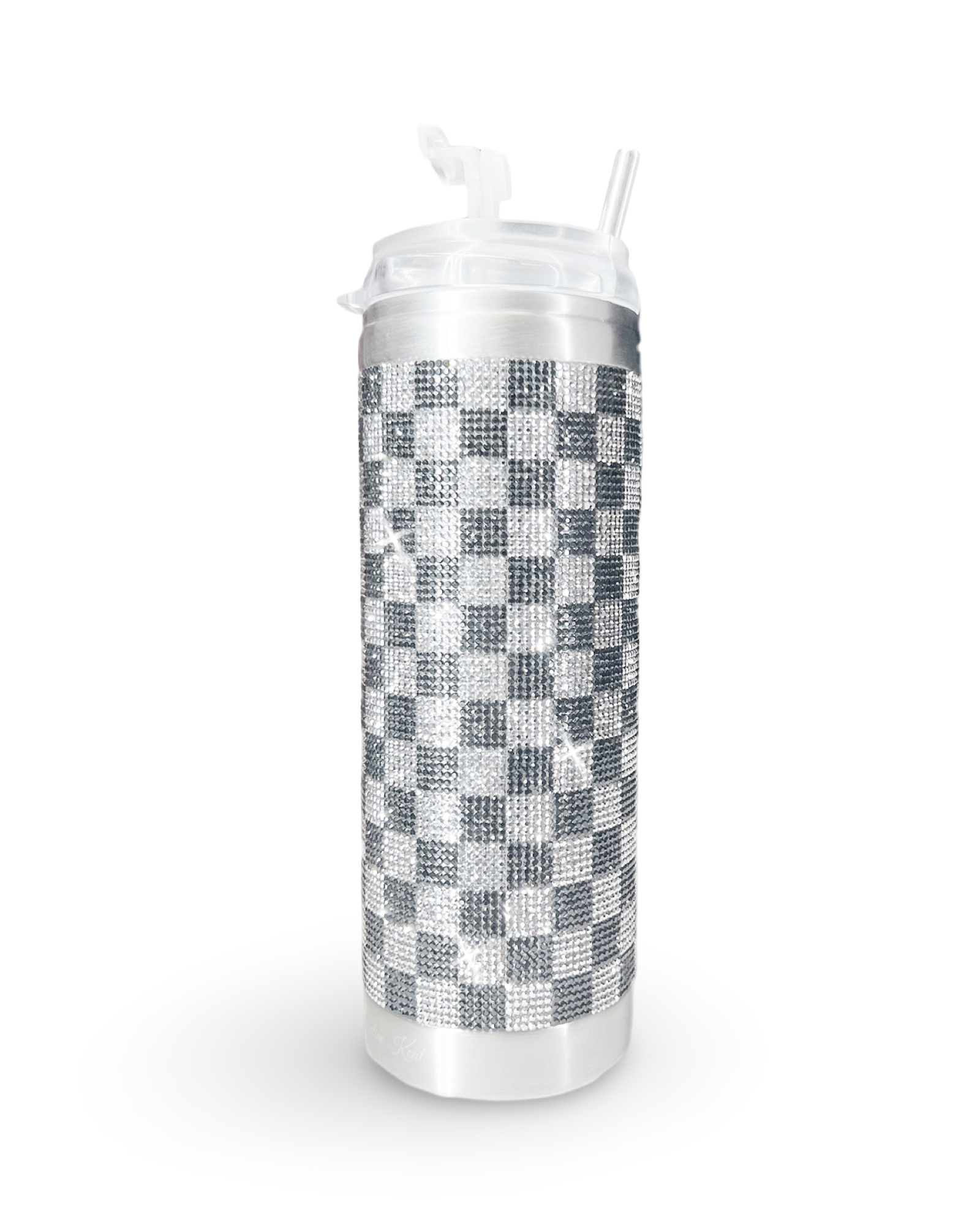 Crystal-Embellished 20oz Stainless Steel Tumbler – Light Grey Check