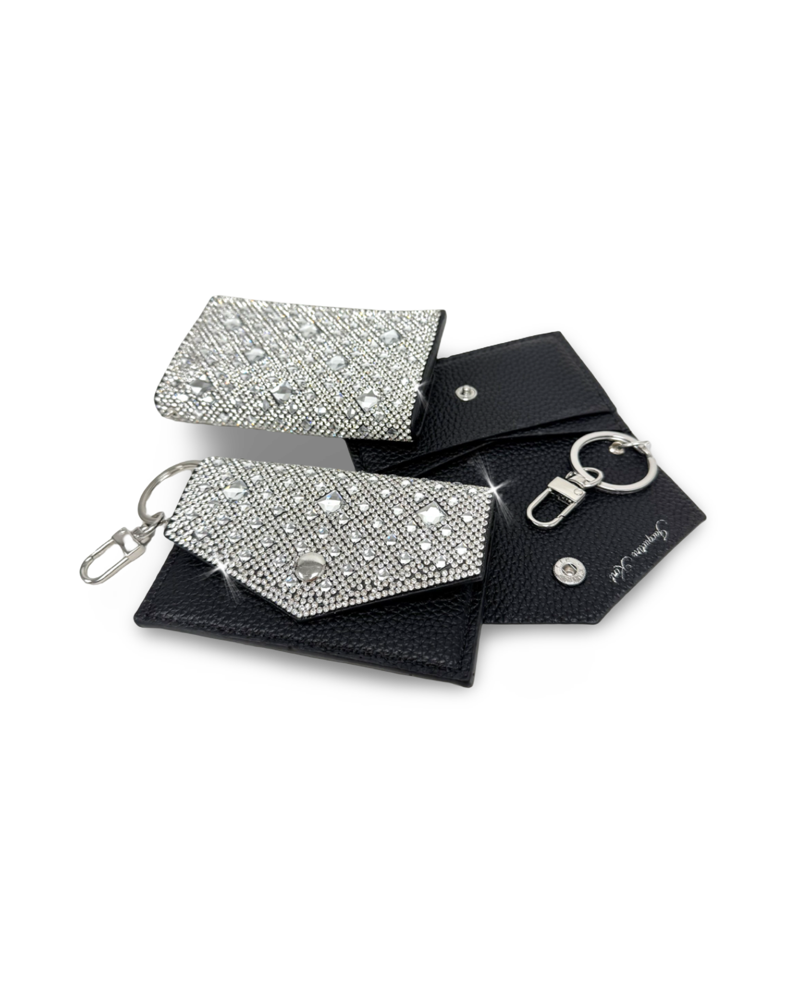 Shine on the go with this crystal mini card wallet! Designed to hold up to three standard cards or 5–6 business cards, this compact accessory combines function with flawless sparkle. A secure snap dome closure keeps your essentials in place, while soft vegan leather adds a luxe touch. Finished with premium glass-cut crystals, durable high-quality hardware, a key ring, and a 360° swivel clip, this wallet is made to dazzle on your keys, bag, or belt loop — wherever you need a little extra shine.