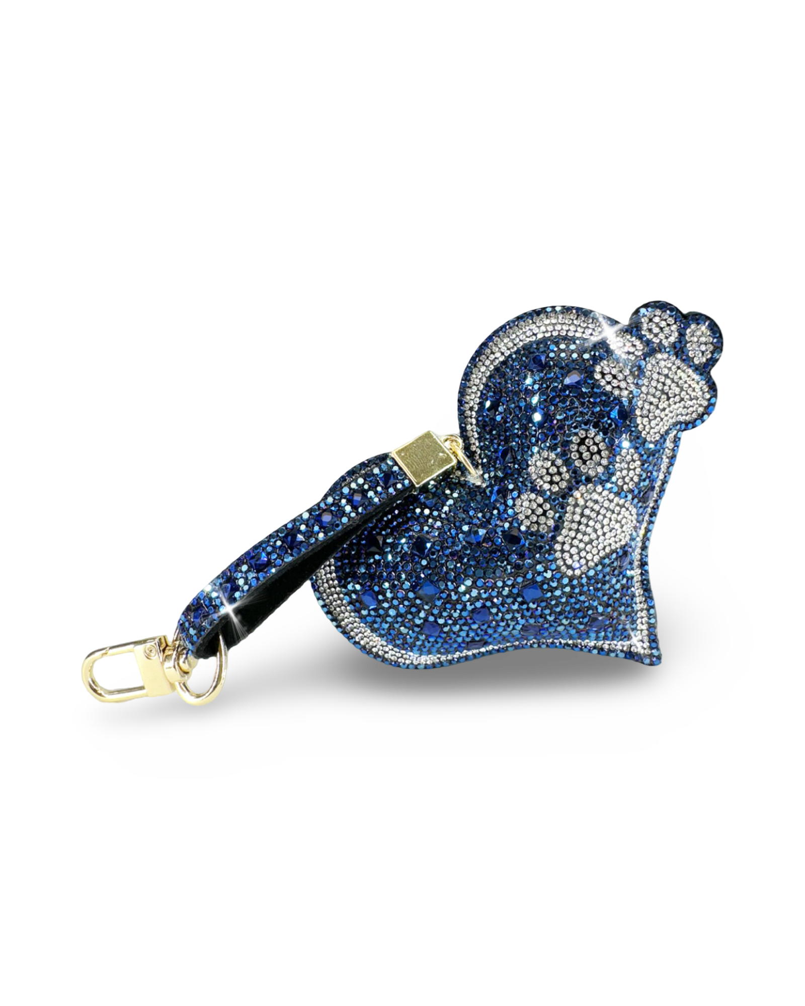Add a touch of sparkle with this eye-catching crystal heart charm! Measuring 3” x 3.5” (6” tall with hanger), this puffy heart is fully encrusted in dazzling crystals on the front, paired with a soft vegan leather back for luxe comfort. Finished with a swivel stainless steel clasp and a rhinestone-studded strap, it’s the perfect accessory to glam up your purse, keys, or tote.