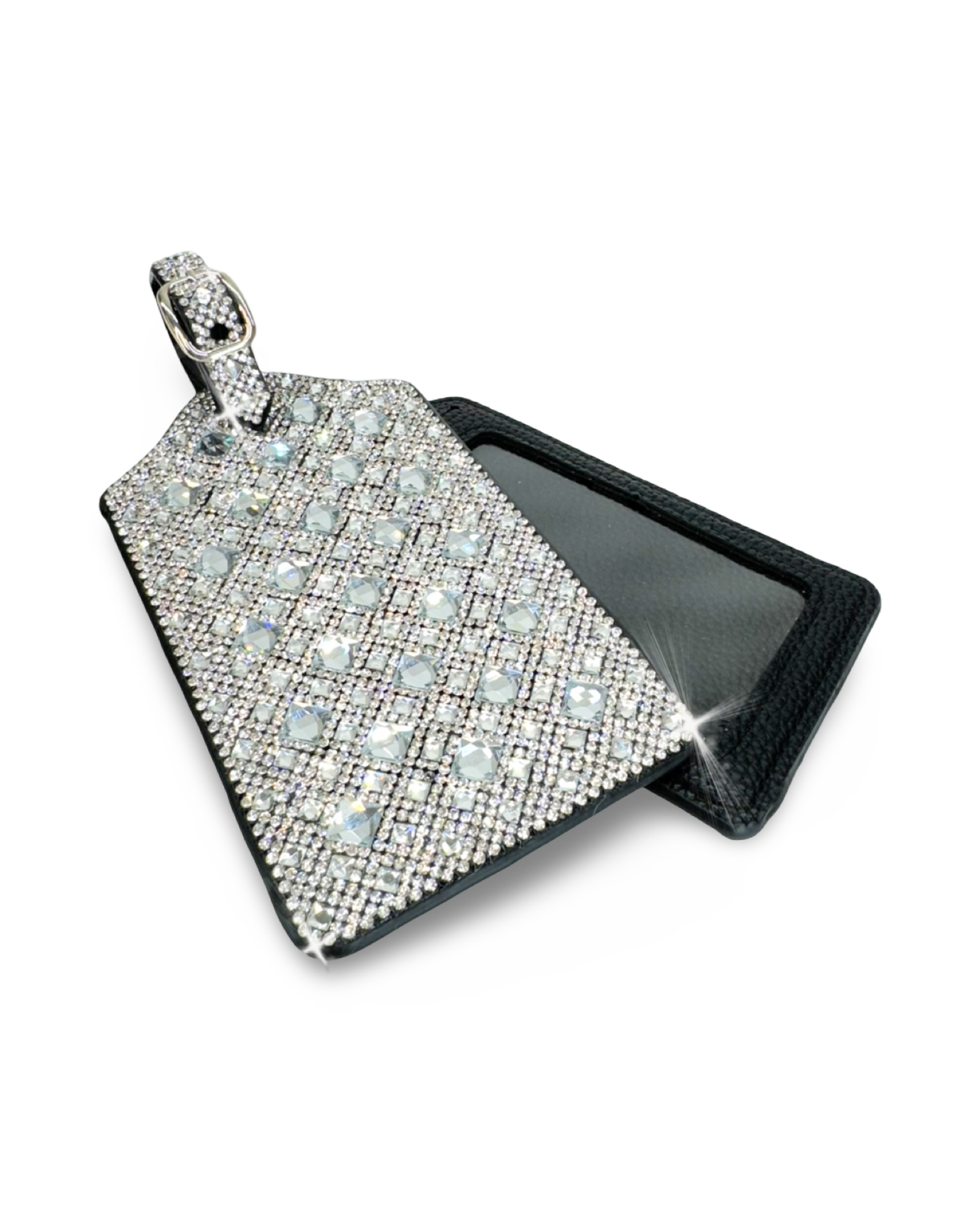 Spot your bag in style with these crystal-studded luggage tags! Crafted from soft vegan leather for a luxurious feel, these tags feature a sparkling crystal-encrusted front that stands out on any suitcase. The sturdy belt-loop strap ensures secure attachment to your luggage, making it easy to identify your bag on the carousel while adding a touch of glam to your travels.